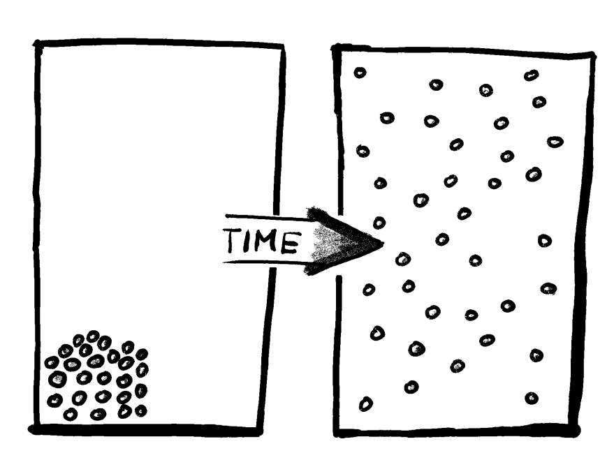 Put differently, the second law says that it becomes increasingly unlikely to find a configuration of the particles where they are all in one corner of the box in above picture – most often you will find them randomly spread over the whole space (the configuration with the lowest degree of order).