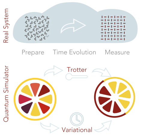 Having a closer look on how the dynamics exactly looks like in a quantum simulation, there exist two typical pathways to time evolve a controlled quantum system: Either Variational, or Trotter simulation. This is a bit like the difference between an oven-ready meal and a constantly stirred dish from the pot. In both cases, the properties of the time evolved solution (e.g. a tasty dish) witnesses information about the real system which cannot be measured or computed directly.
