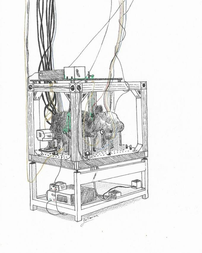 The first time I entered in the room where the cold atom experiment was, I couldn’t express what I felt… Wires everywhere, optical fibers sending lasers all over the room, a metallic vacuum chamber hidden by a huge amount of copper wire, optical fibers and water cooled magnetic coils… A big mess. My supervisor asked me to have a look inside the vacuum chamber through a thick glass. After five minutes trying to find the right angle I finally saw it. A red bubble surrounded by darkness. This was a billion atoms trapped in the vacuum… I was really impressed.